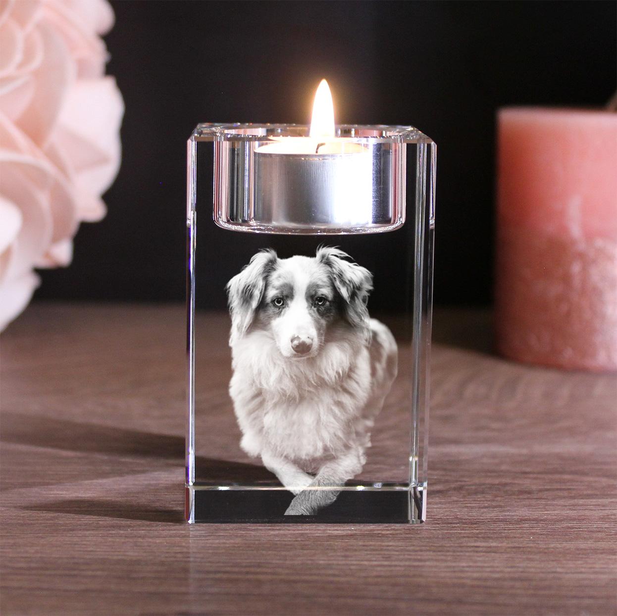 Mit diesem schönen Teelichthalter können Sie einen ganz besonderen Moment mit Ihrem Haustier für die Ewigkeit festhalten. Wir gestalten für Sie Ihr persönliches Dekoobjekt ganz nach Ihren Wünschen. Wir erstellen eine Gravur Ihres Wunschfotos wahlweise in 2D oder 3D. Ebenfalls haben Sie die Wahl ob wir ein Foto mit nur einem Tier, mehreren Tieren oder ein Bild von Ihnen gemeinsam mit Ihrem Tier nutzen. Ihren Lieblingsmoment können wir mit einem Wunschtext ergänzen.
