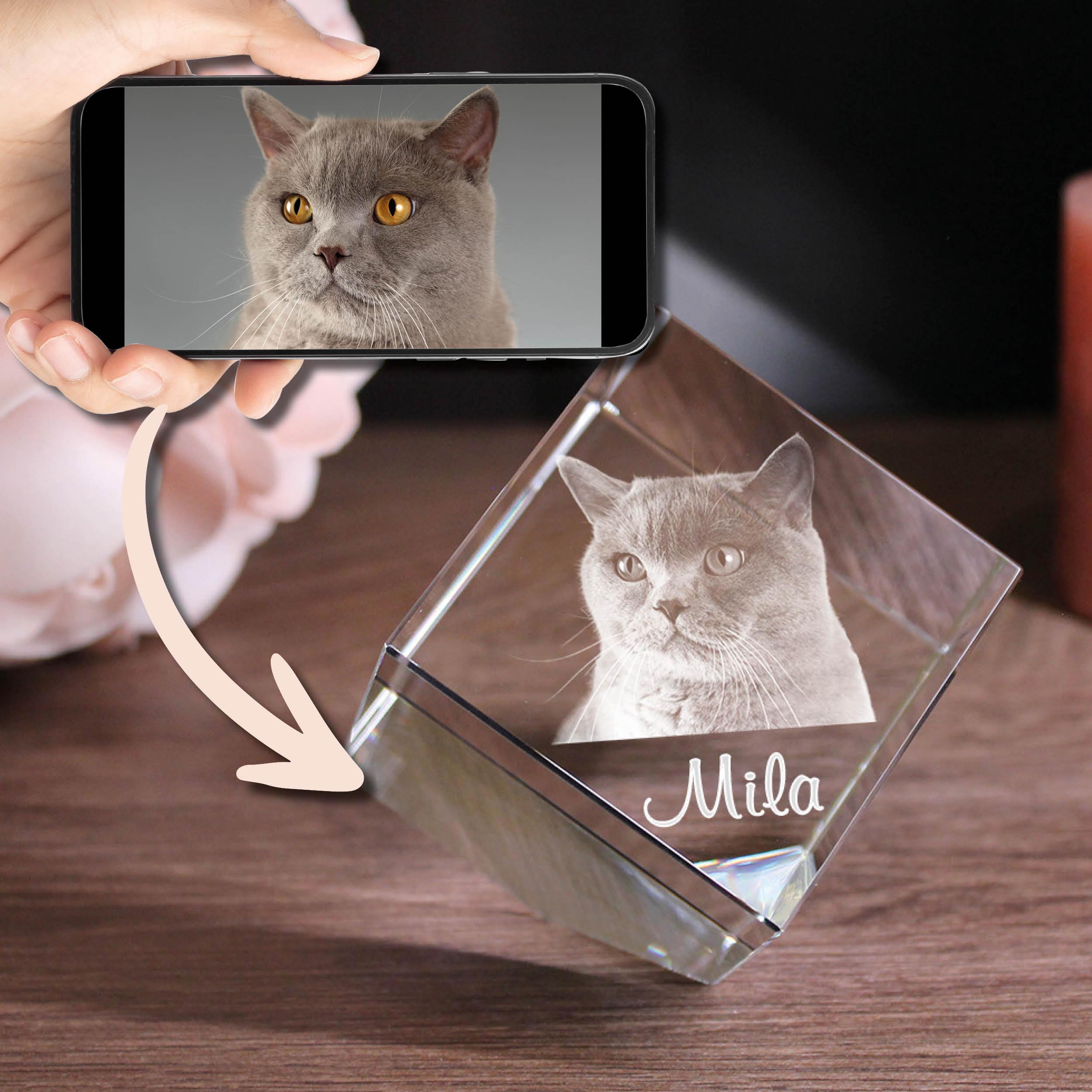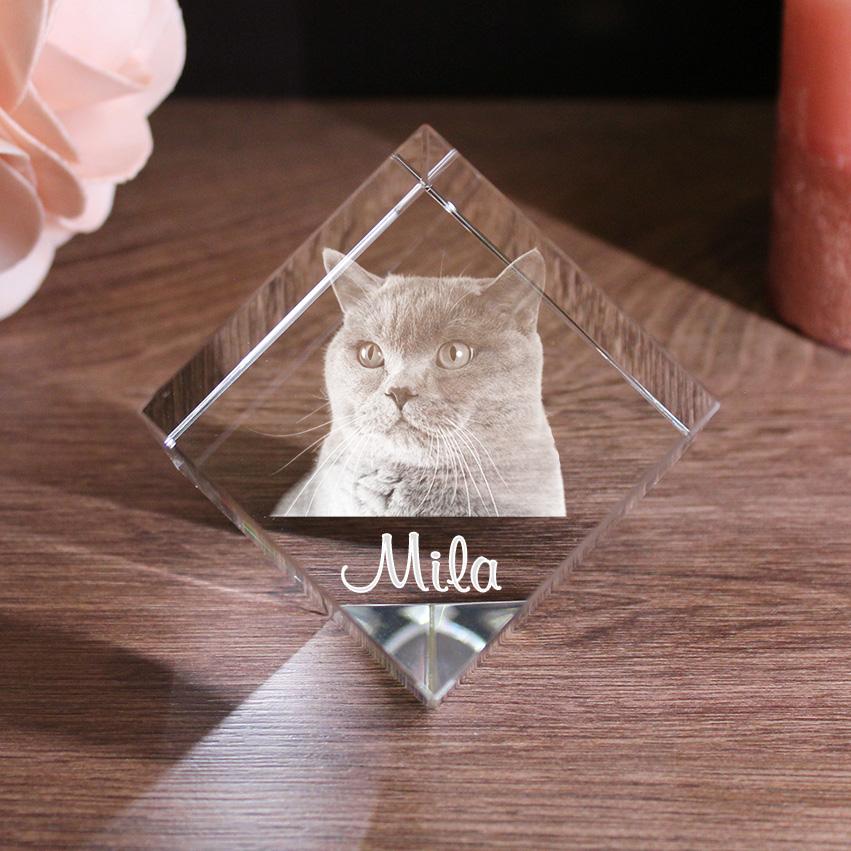 Mit diesem schönen Glasfoto können Sie einen ganz besonderen Moment mit Ihrem Haustier für die Ewigkeit festhalten. Wir gestalten für Sie Ihr persönliches Erinnerungsstück ganz nach Ihren Wünschen. Sie haben die Wahl, und können aussuchen, ob wir Iht Foto in 2D oder 3D gravieren sollen. Ebenfalls entscheiden Sie darüber, ob wir ein Foto mit nur einem Tier, mehreren Tieren oder ein Bild von Ihnen gemeinsam mit Ihrem Tier nutzen. Ihr Lieblingsfoto können wir mit einem Wunschtext ergänzen. Das besondere an der Corner-Cut Form ist, dass der Glaswürfel "auf der Ecke" steht.