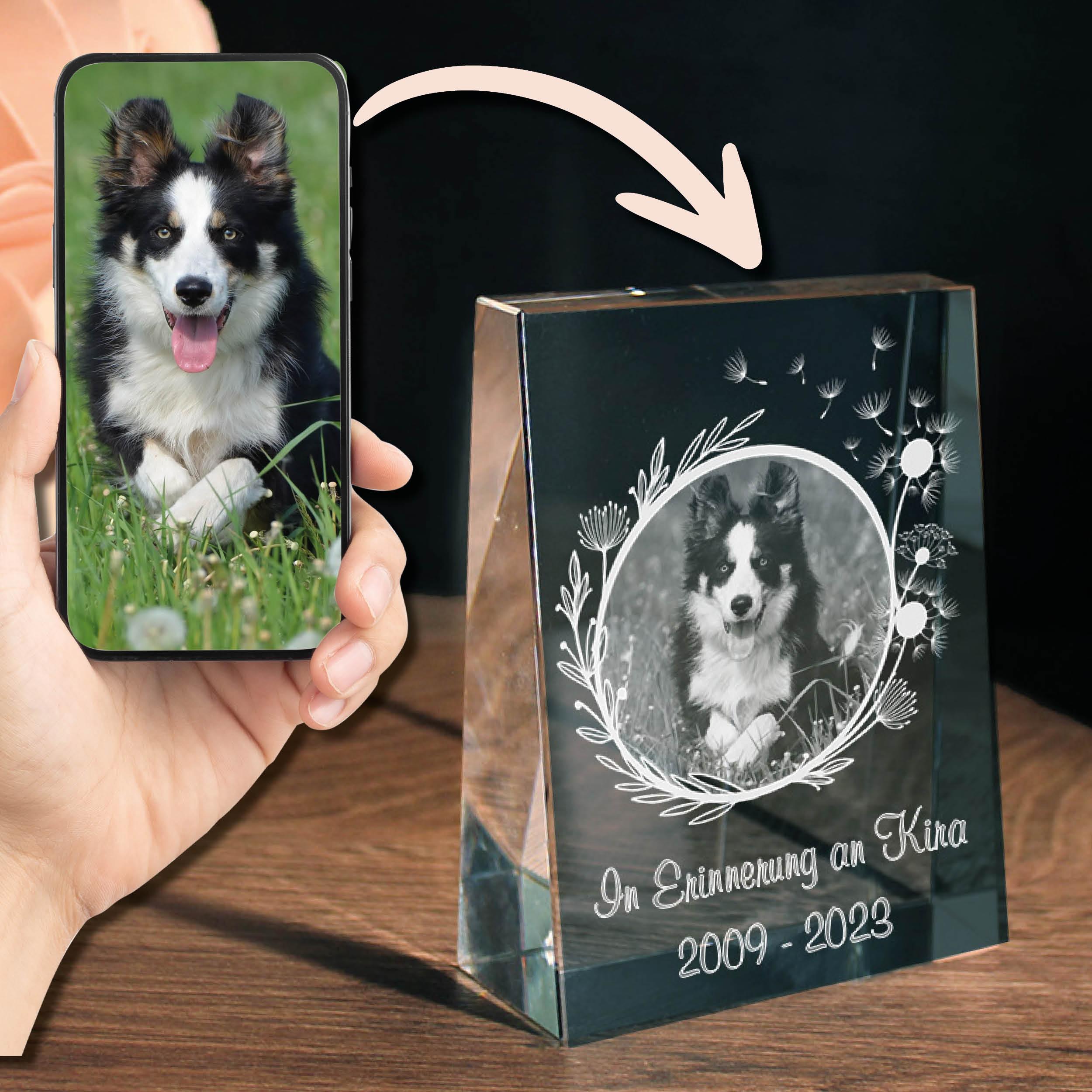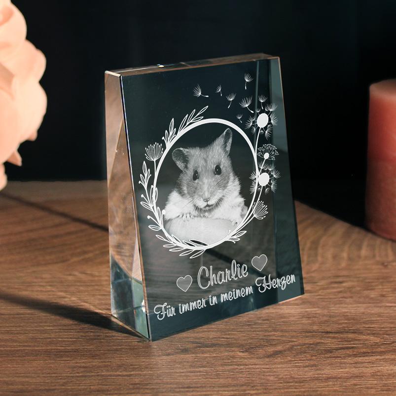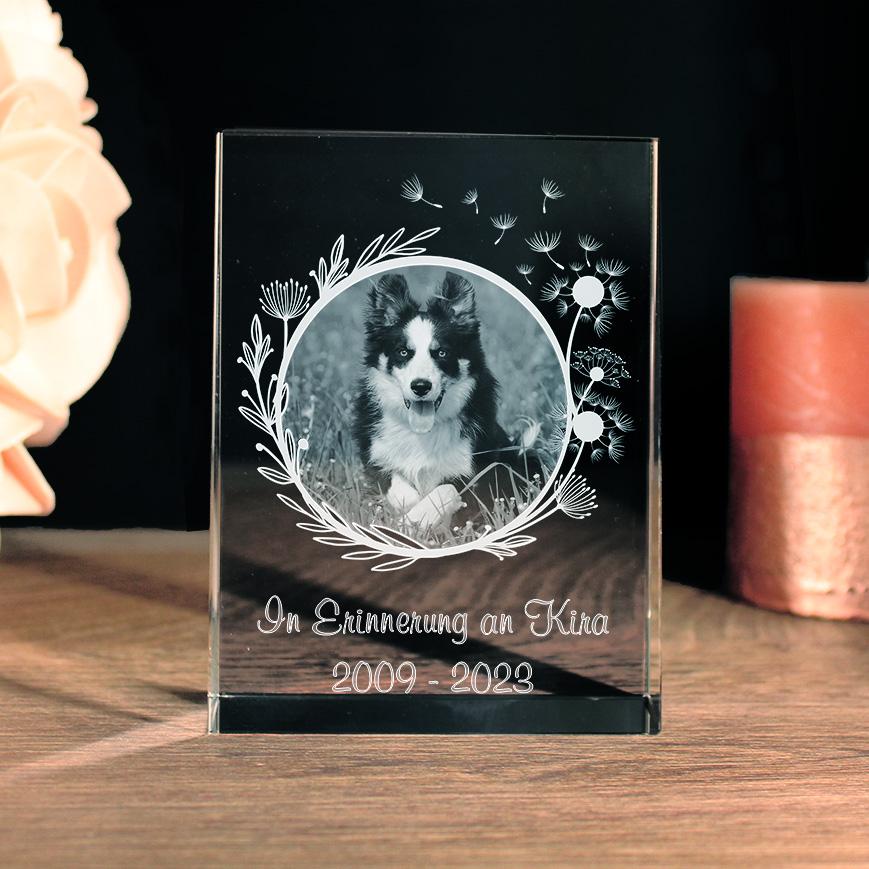 Mit diesem schönen Glasfoto können Sie einen ganz besonderen Moment mit Ihrem Haustier für die Ewigkeit festhalten. Wir gestalten für Sie Ihr persönliches Erinnerungsstück ganz nach Ihren Wünschen. Wir erstellen eine Gravur Ihres Wunschfotos in 2D. Ebenfalls haben Sie die Wahl ob wir ein Foto mit nur einem Tier, mehreren Tieren oder ein Bild von Ihnen gemeinsam mit Ihrem Tier nutzen. Besonders wird das Foto durch den besonderen, schönen Rahmen hervorgehoben.