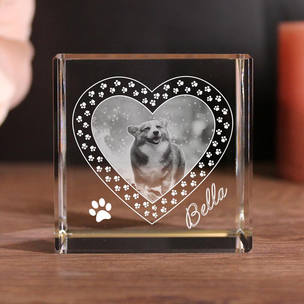 Petmemoria 2D Glaskristall Würfel mit Pfoten-Herzrahmen